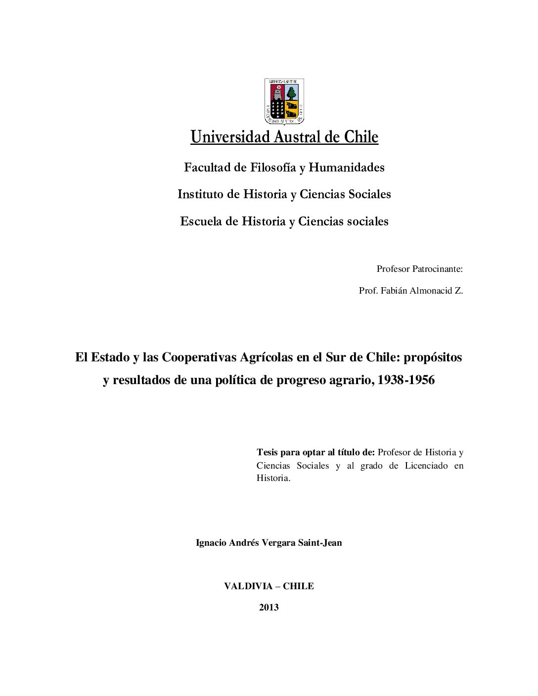 El Estado y las Cooperativas Agrícolas en el Sur de Chile: propósitos y resultados de una política de progreso agrario, 1938-1956