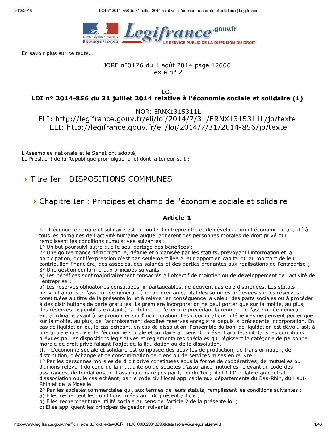 LOI n° 2014856du 31 juillet 2014 relative à l’économie sociale et solidaire