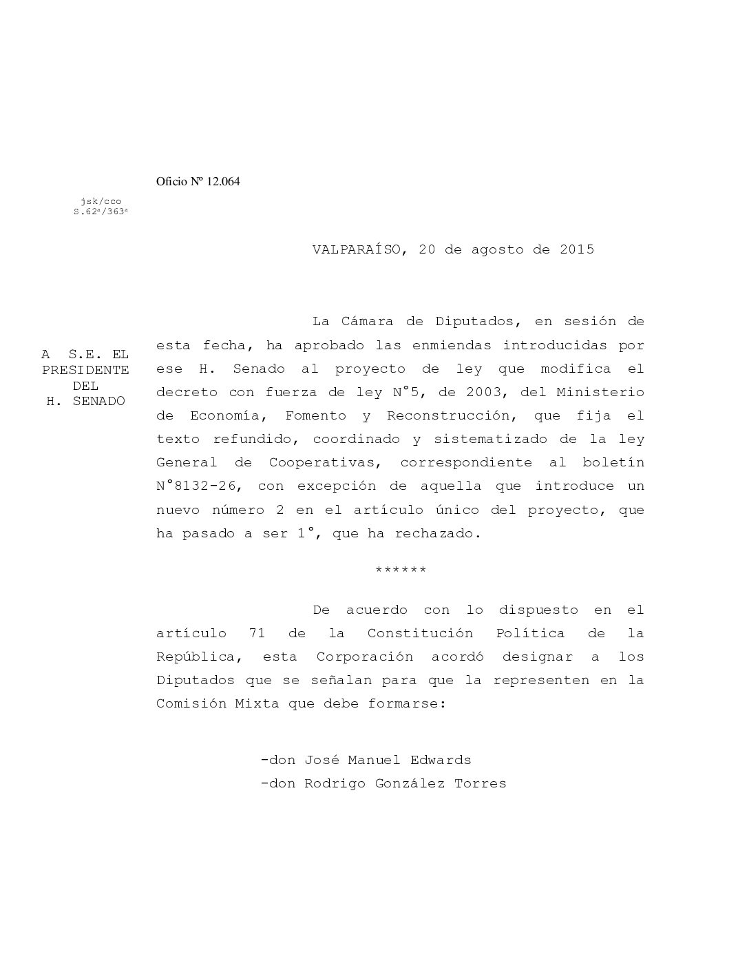 Aprobación de las enmiendas introducidas por ese H. Senado al proyecto de ley que modifica el decreto con fuerza de ley N°5, de 2003, del Ministerio de Economía, Fomento y Reconstrucción, que fija el texto refundido, coordinado y sistematizado de la ley General de Cooperativas, correspondiente al boletín N°8132-26