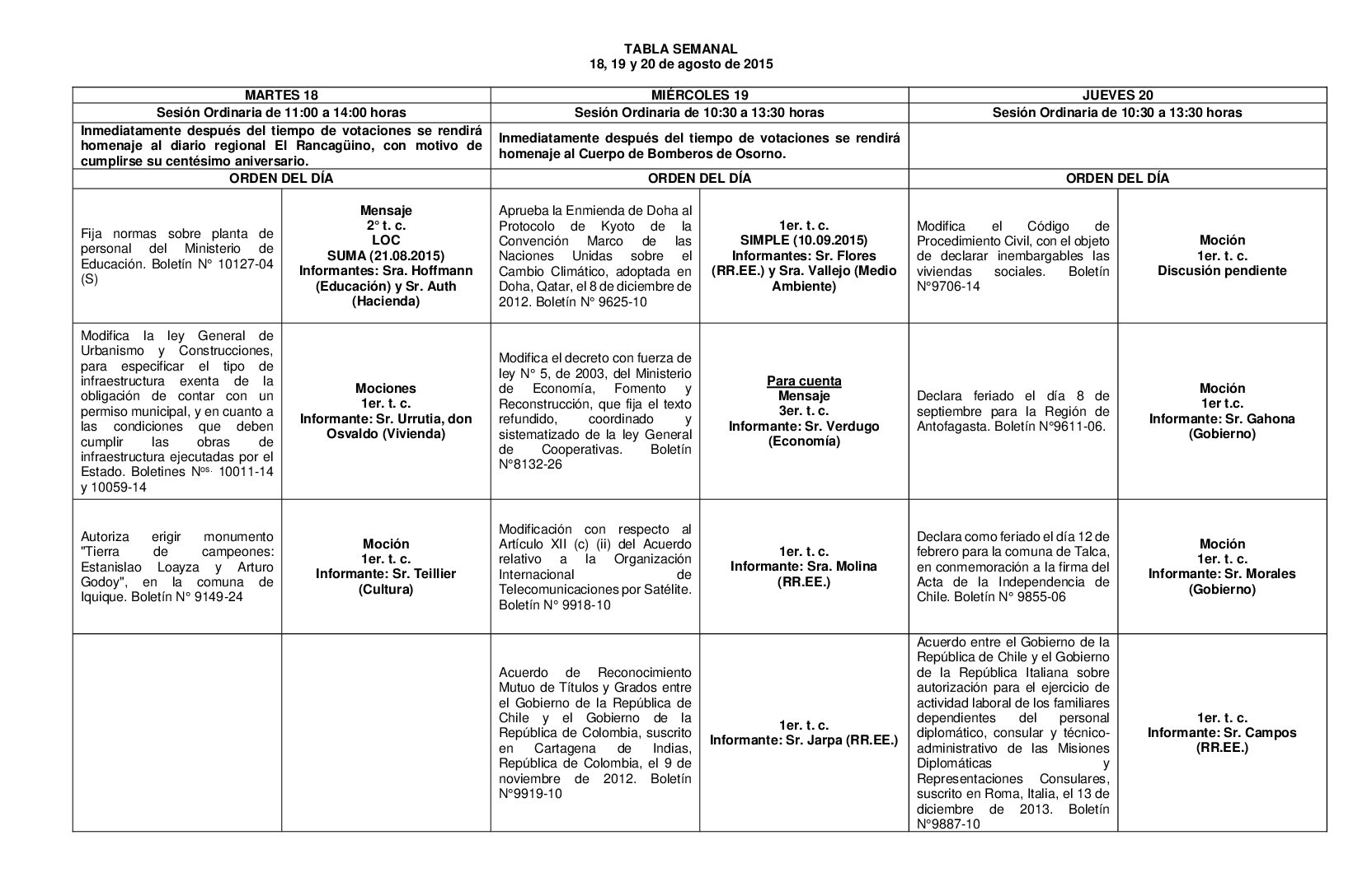 Tabla semanal 18, 19 y 20 de agosto de 2015 de la Cámara de Diputados