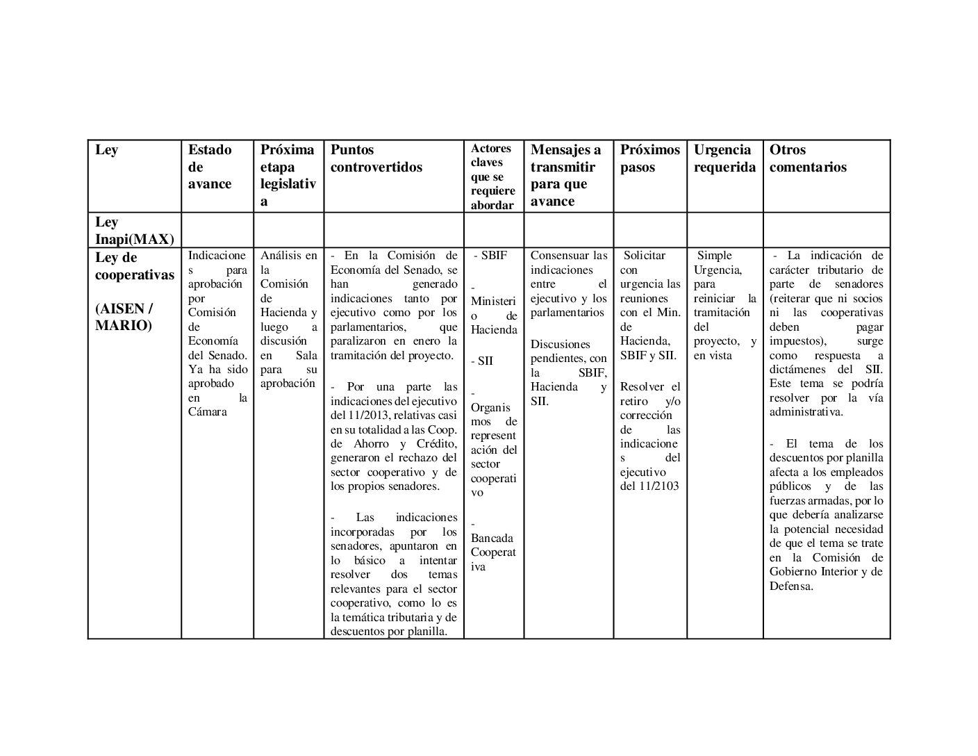 Estado de avance de la Ley de cooperativas