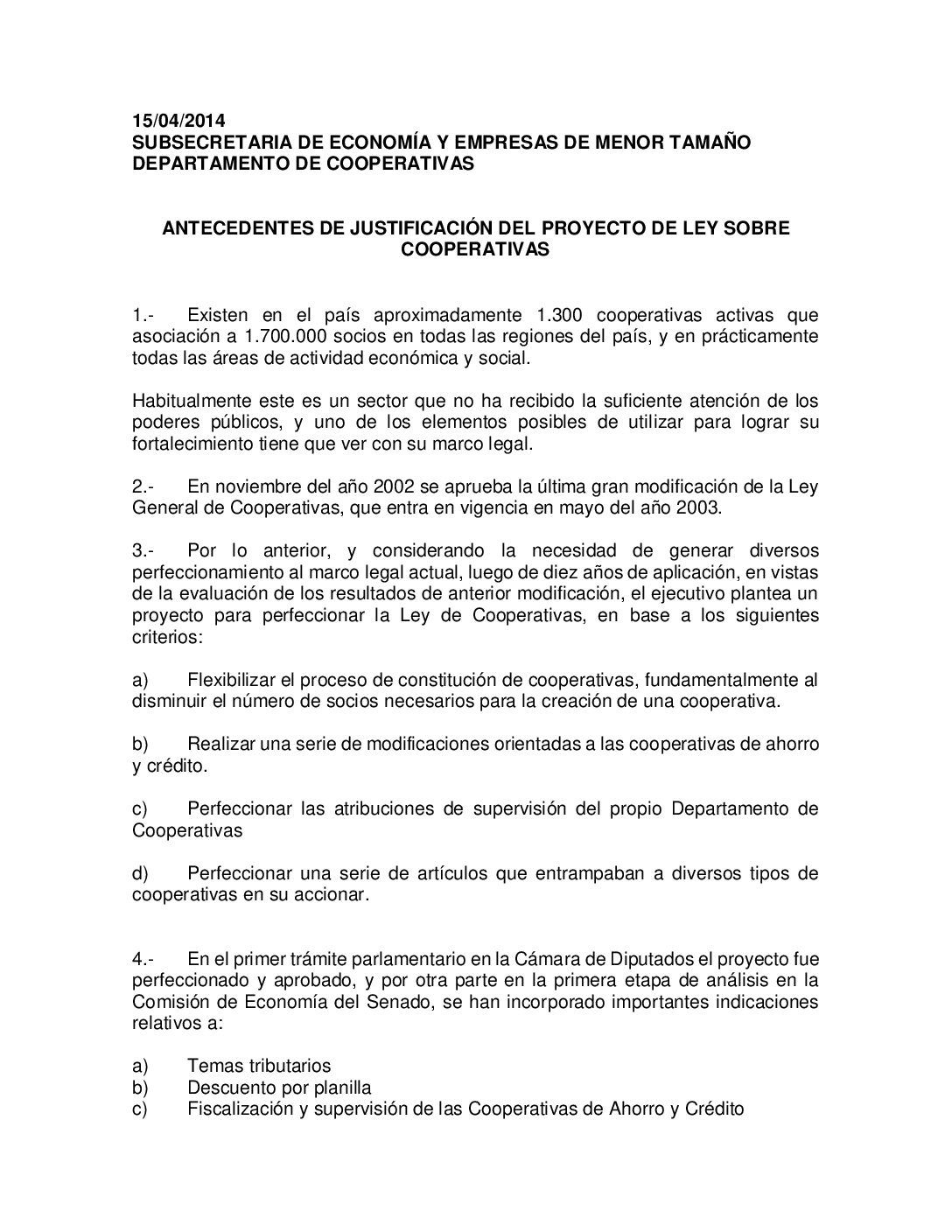 Antecedentes de justificación del proyecto de Ley sobre cooperativas