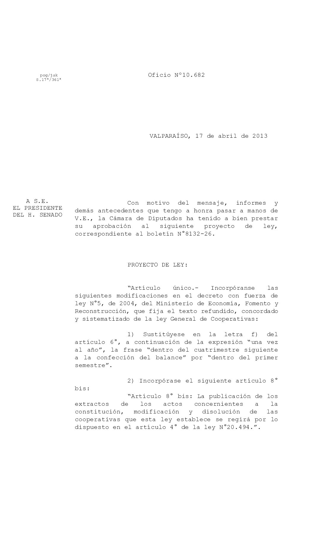 Oficio Nº10.682. Con motivo del mensaje, informes y demás antecedentes que tengo a honra pasar a manos de V.E., la Cámara de Diputados ha tenido a bien prestar su aprobación al siguiente proyecto de ley, correspondiente al boletín N°8132-26.