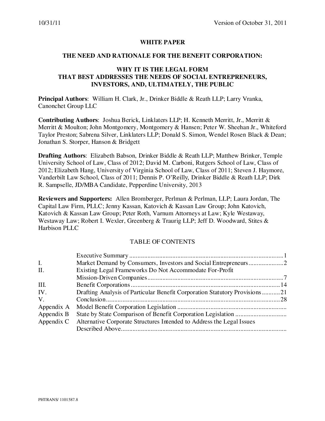 The Need and Rationale for the Benefit Corporation: Why it is the Legal form that Best Addresses the Needs of Social Entrepreneurs, Investors, and, Ultimately, the Public