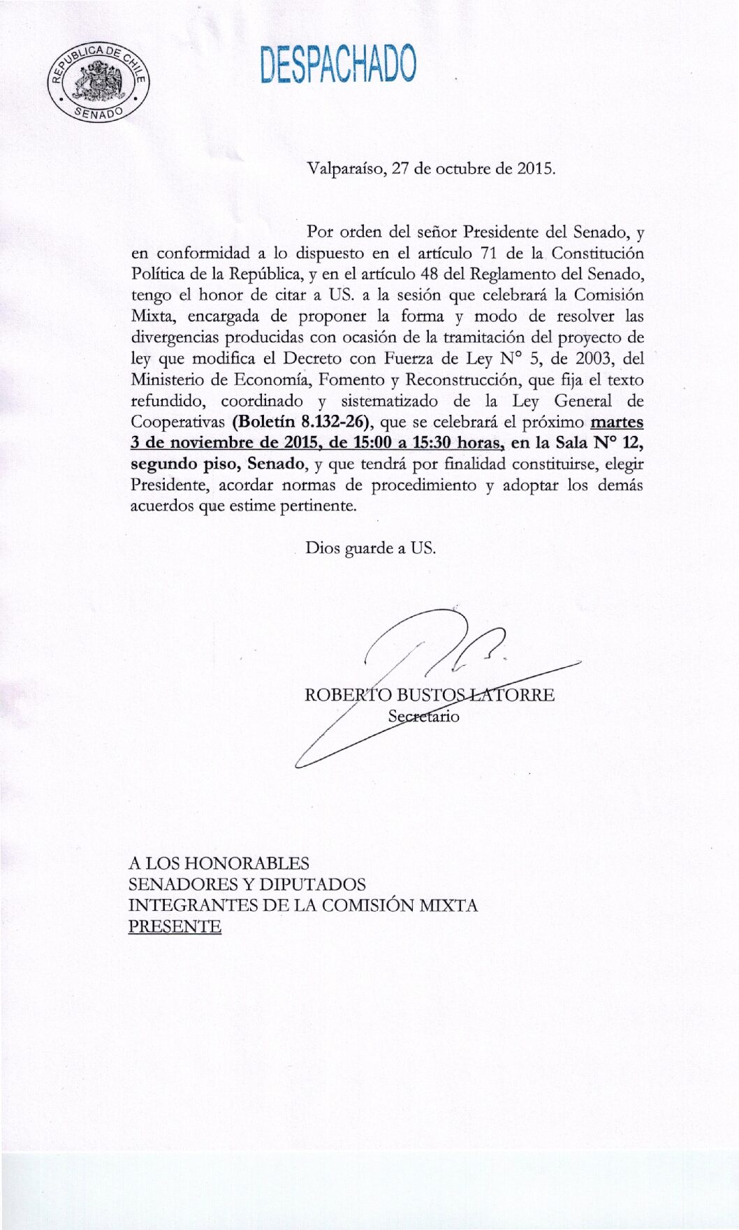 Citación Comisión Mixta para tramitación del proyecto que modifica el Decreto con fuerza de Ley N° 5 de 2003
